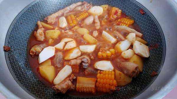 大概划拉匀看情况加水或者倒鸡汤,根据个人喜好和饭量往里切碳水,比如土豆玉米小芋头山药红薯胡萝贝什么的