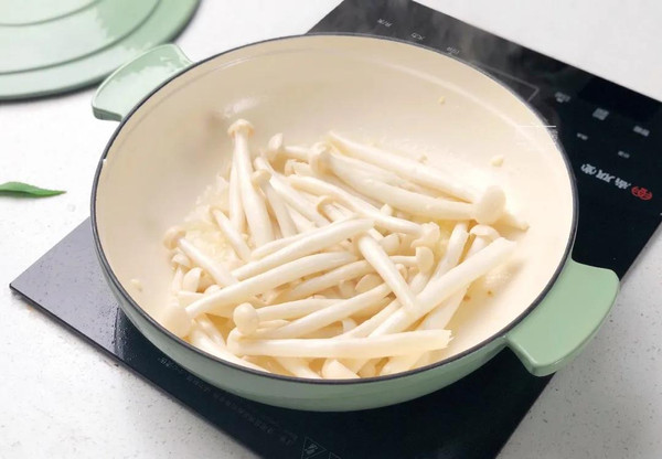 重新起锅倒油,放入蒜末煸炒出香味后倒入海鲜菇炒香(内外双层比利时珐琅釉料,历经三次700度高温煅烧,保证食品安全和釉面稳定);