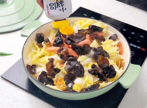 放入娃娃菜、黑木耳、火腿肠、2克食盐、10克优选鲜材的小鲜侣调味汁;