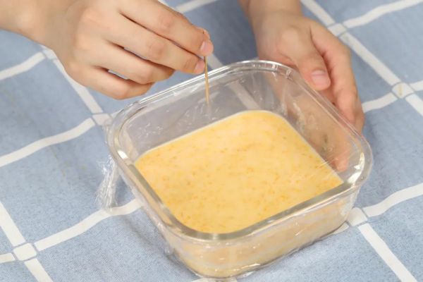 在方形玻璃碗中刷油,然后垫上油纸,倒入面糊震几下将面糊震平。盖上保鲜膜,四周用牙签扎洞。