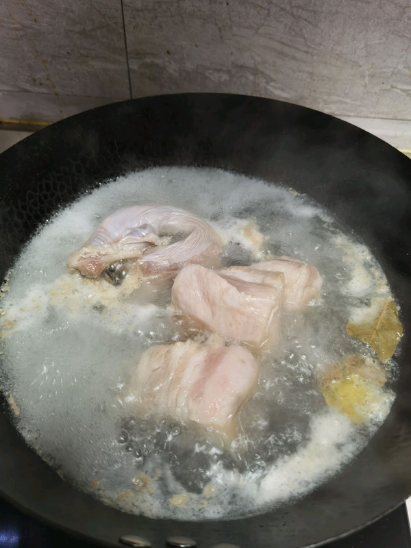 五花肉、隔山下锅煮。放入两片香叶,一片八角,姜,酒,盐。