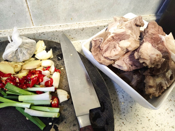 1.牛骨泡冷水,去血水,可以换两次水 2.牛骨焯水后,流水洗干净 3.准备好香料,辣椒,大蒜,姜片