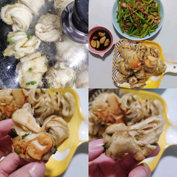 卷成形,饼铛倒油,煎至底部发黄,添水,小花卷的1/3处,盖好盖子