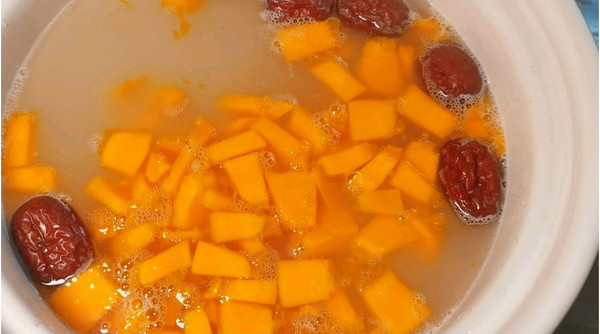 下入我们切好的南瓜,盖上锅盖继续熬30到50分钟。