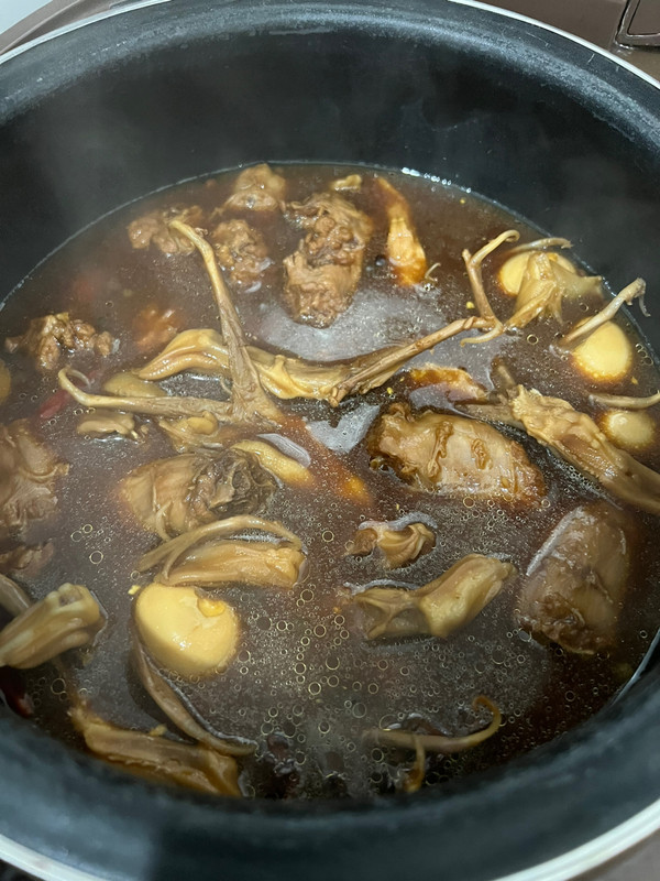 干辣椒花椒姜片茴香八角桂皮冰糖生抽老抽甜面酱家乐浓汤宝,然后一罐啤酒倒进去,我用的是百威,然后加水没过食材,调味重一些没关系的