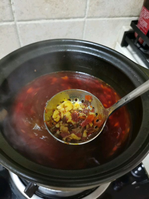 放上葱花香菜,另一半蒜末,干辣椒,浇上热油滋一下就可以了。