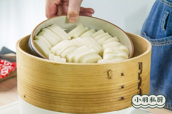 鸡蛋打散,把蒸好的年糕放进去打个滚,裹上一层蛋液。