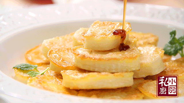 把熬好的糖浆淋在煎过的年糕上,就可以开吃啦。