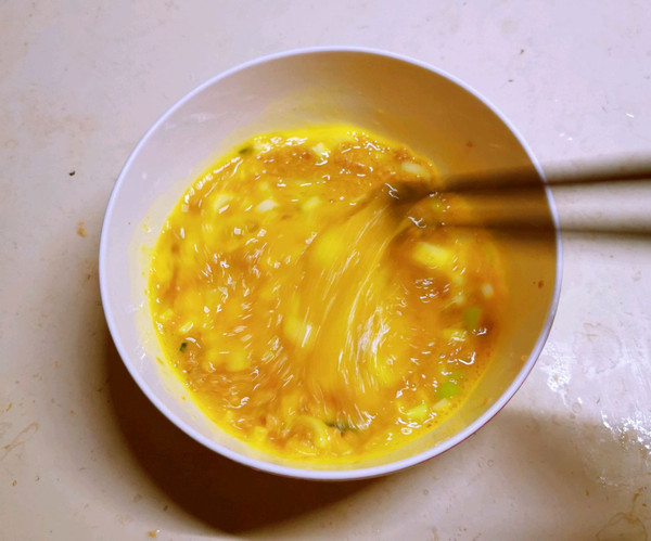 鸡蛋敲入碗中,大葱切碎和虾酱一同放入碗中。