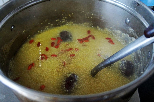 锅中加入适量的水,要多加一点,中途不能加水,同时放进红枣,大火烧开,再煮上5分钟左右,然后下入淘洗干净的小米,用勺子搅拌均匀再大火烧开,转小火。切记:小米一定要开水下锅,不糊底不粘锅。