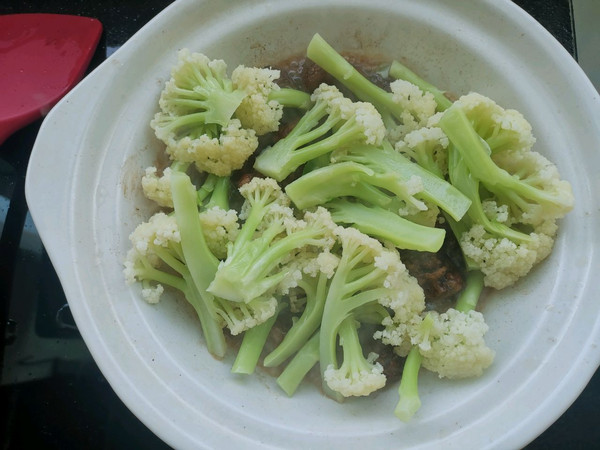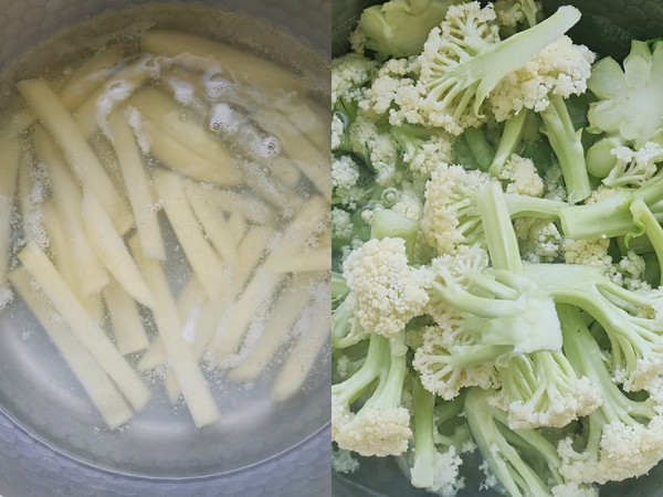 土豆切条,煮几分钟。花菜也绰水,煮几分钟。