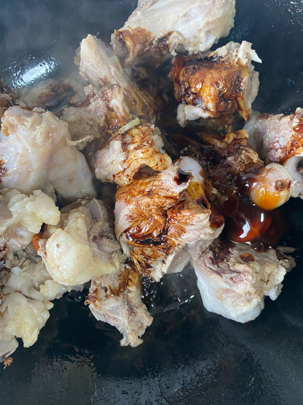 放入羊骨、红烧酱油、生抽、老抽、蚝油翻炒均匀;