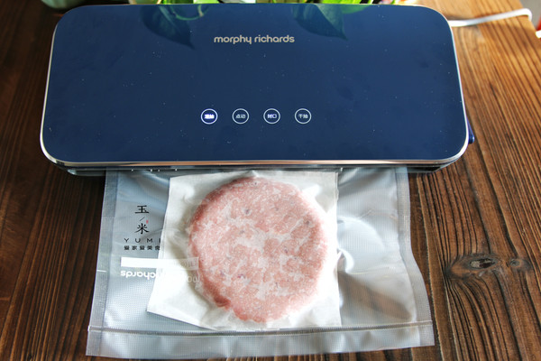 全部做好之后用袋子一个个装好,再用摩飞真空封口机抽真空封好袋口,冷藏保鲜长达一星期。当然了,最好还是放冰箱冷冻保存,食用前像牛排一样低温解冻再煎,这样能保证肉饼的新鲜度及口感,防止肉饼变质。