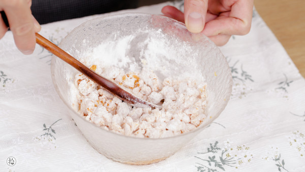 2.在红薯泥中加入低筋面粉,混合均匀,揉成红薯团。(Tips:加面粉是因为红薯的吸水性不同,红薯泥如果太湿,可以适当加一点面粉来调整湿润度)
