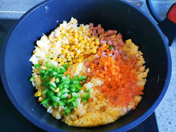 米饭炒到蛋液凝固,米粒分明的状态后加入熟玉米粒,胡萝卜丁,午餐肉丁和青椒丁,翻炒均匀。最后放一片安佳芝士,奶香味便有了,也更容易造型!