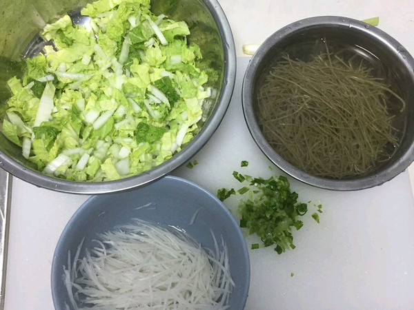 醒面的时候可以准备菜了,细粉提前泡软、萝卜搓丝,白菜切细条(然后再切半,萝卜也是,细粉切两厘米左右长)