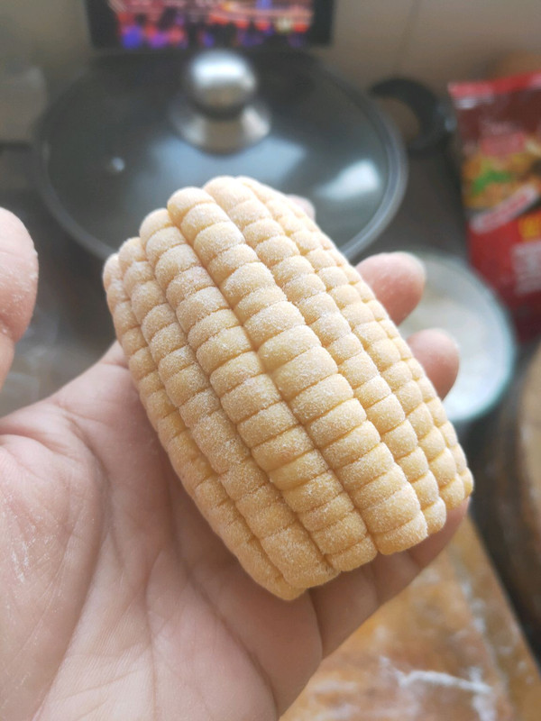 黄色的面擀成片切出均匀的印子,再纵向一厘米切断,用筷子夹成一排玉米粒的形状,做若干个,白色面做里面的芯