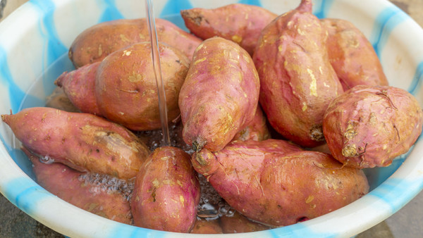 先来洗红薯,我这里一共是15斤左右,自己家种的都是红心薯,出粉没有白心的高,表面的泥土先洗干净。 然后把有疤和有黑点的地方削掉,全部处理好后再来切块儿,接着倒入破壁机中加清水打成红薯泥。