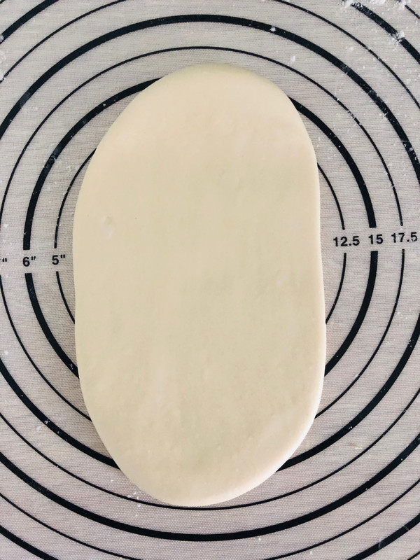 抹茶色面团操作和刚才的白色面团一样,光滑面朝上盖在白色面团上面。