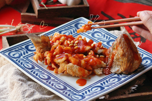 同时将鱼头也炸好,沥去多余油。