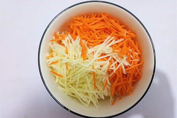 土豆胡萝卜丝中依次加入2茶匙面粉、葱花、食盐、五香粉。土豆本身淀粉丰富,面粉不需要太多,加了2茶匙。