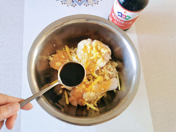 再加入味达美冰糖老抽半勺,一点黑胡椒,和姜丝蒜末,蜂蜜混合揉搓鸡腿,让鸡腿表面均匀蘸满调味料,腌制30分钟。