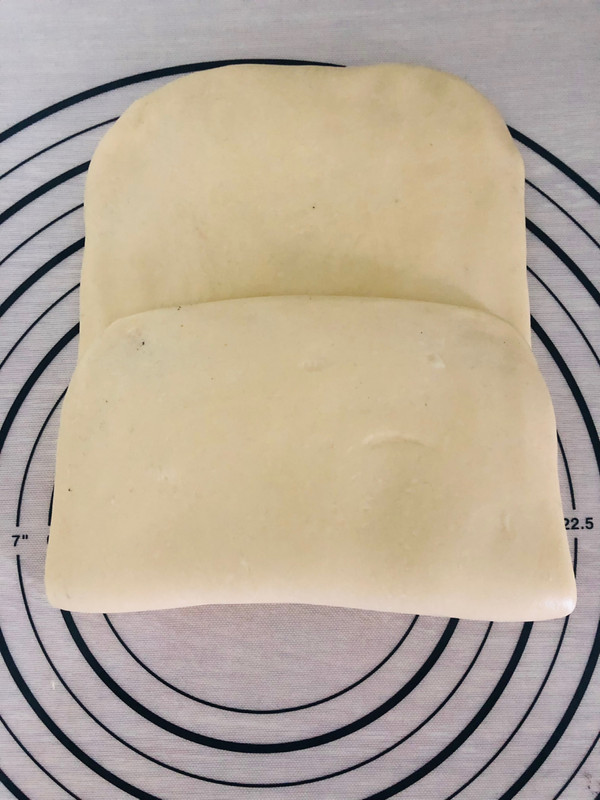 松弛好的面团光滑面朝下擀成长方形,在长方形下三分之一处抹上三分之一黑芝麻馅(黑芝麻馅做法就是室温软化的黄油和奶粉糖黑芝麻粉搅拌均匀即可)。