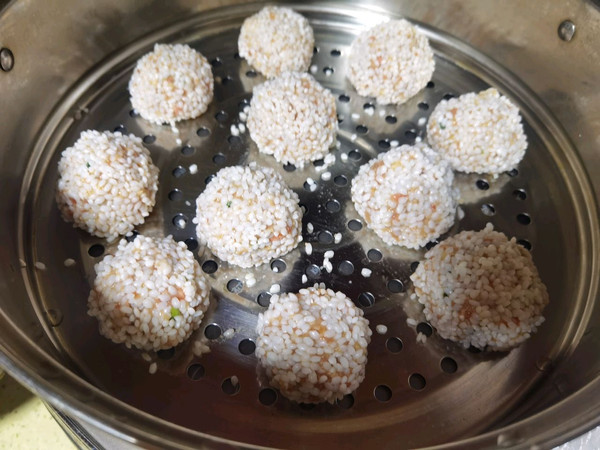 把猪肉搓成圆球,滚上糯米。锅里水沸腾后上锅蒸40分