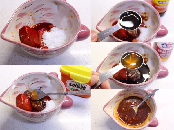 配制酱汁:红腐乳以及汁1块+盐3克+糖3克+甜面酱2勺+生抽3勺+料酒2勺,搅拌均匀备用;