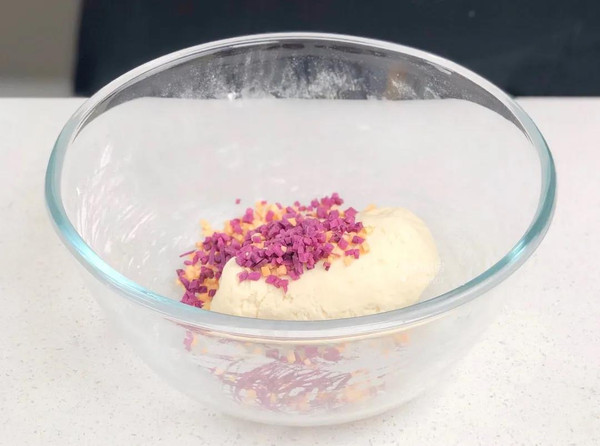 揉成光滑的团状后加入20克紫薯丁、20克红薯丁,再次揉搓混合均匀;
