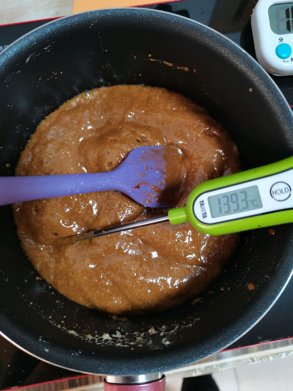当温度140度时关火,加入温热的坚果翻拌均匀