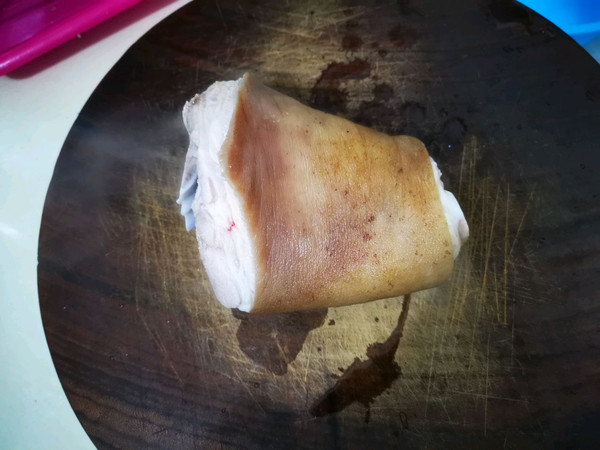 炸好整个丢高压锅卤10分钟,(加姜2根,红萝卜切片1根,洋葱切片1个,沙姜2颗,八角2颗,香叶10张左右,肉蔻3个,桂皮一小块,草果1小颗,盐3勺,鸡精2勺,耗油2勺,豆瓣酱1勺,十三香1勺,干辣椒适量,冰糖块七八块左右,啤酒一罐或者白酒2勺,生抽3勺,老抽1勺加水跟肘子平着就行了)