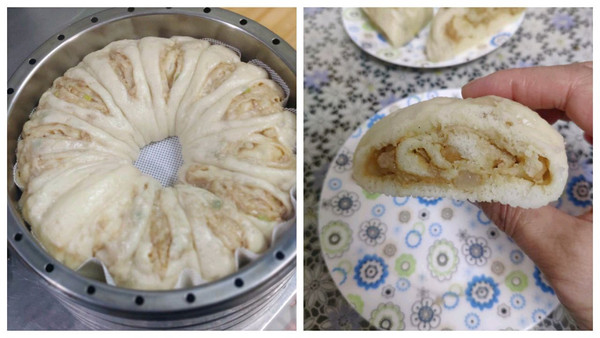 面粉加水加酵母活成面团,进行一发! 猪肉馅加盐料酒老抽蚝朝一个方向搅至上劲,分次加入大料水(葱姜花椒八角加水泡)调成馅料,最后撒上食用油锁住水分! 面团一发面包机发酵一小时即可! 擀成长方形大片,把肉馅均匀抹在面片上,卷起,接口处封紧,成环形!