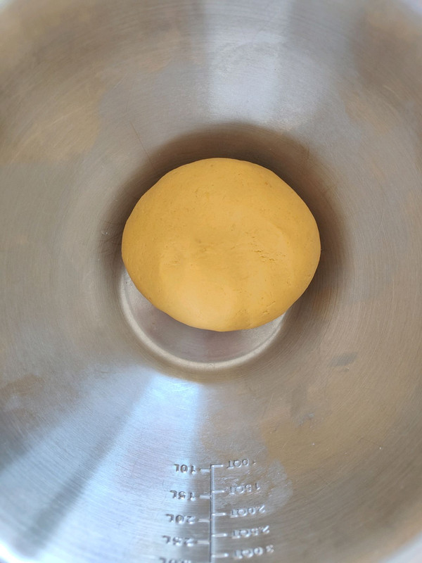 揉匀成团的样子,这个黄色面团是用来制作香芋地瓜丸的外皮。为防表皮风干,可以覆盖保鲜膜放置一旁备用。