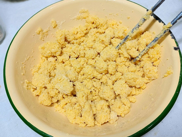 面皮儿加入量好的玉米面面粉,鸡蛋,酵母,植物油,水