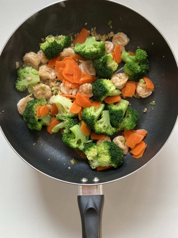 6.热锅喷少油,下蒜末爆香后,倒入腌制好的虾仁炒至均匀变色