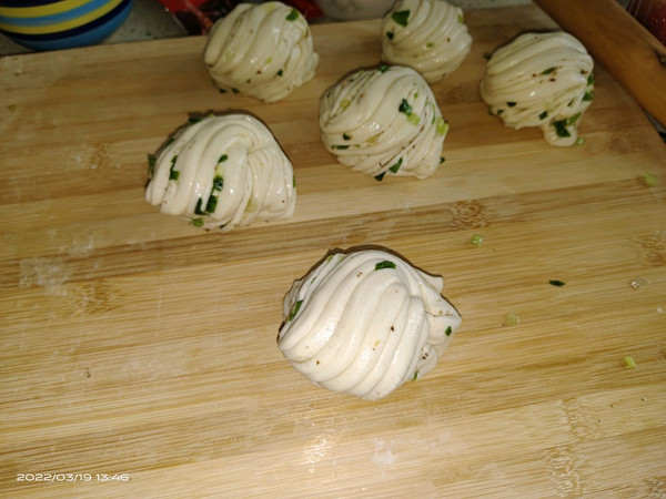 把发酵好的面团重新揉均匀,没有颗粒,干成长方形大概2㎜厚度,均匀撒上花椒粉,盐,葱沫。