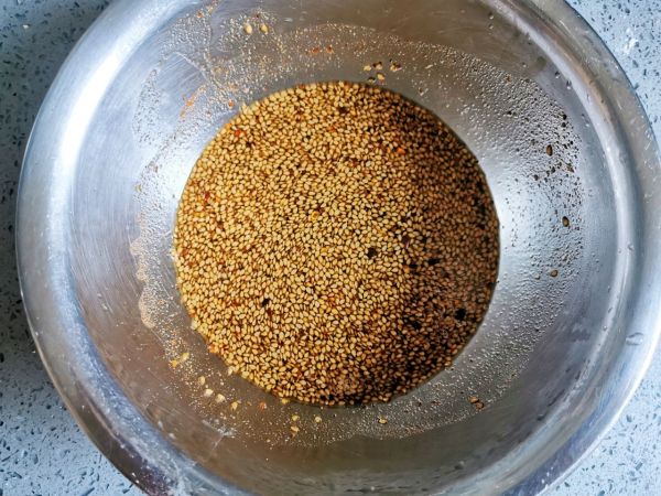取一个容器,加五香粉、孜然粉各半勺,辣椒面1勺,盐1勺,白糖3勺,蜂蜜1勺,白芝麻四勺。