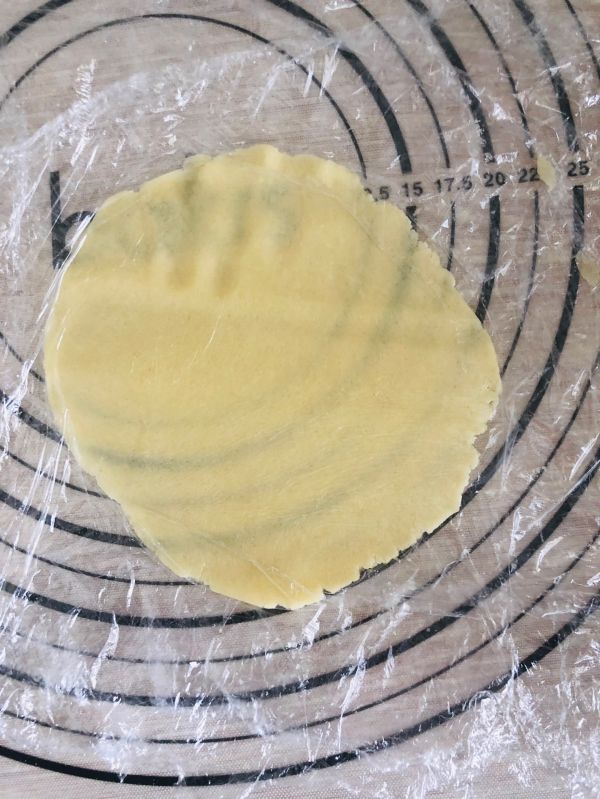 取两张保鲜膜,取一个菠萝酥皮放在中间,擀成圆形大薄片,擀的大一些,要把整个面包都包住。