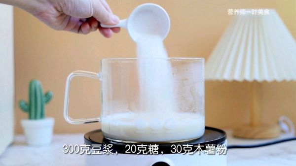 豆香浓郁的豆浆加糖和木薯粉,搅拌均匀