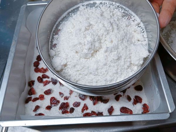 放一半粉类放一层蔓越莓果干