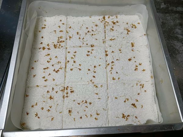 用刮板切块,撒入桂花