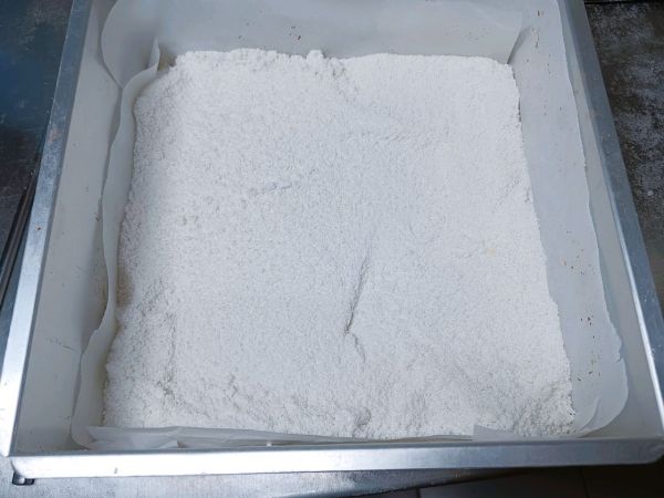 模具里面铺油纸,拌好的粉类筛入模具里