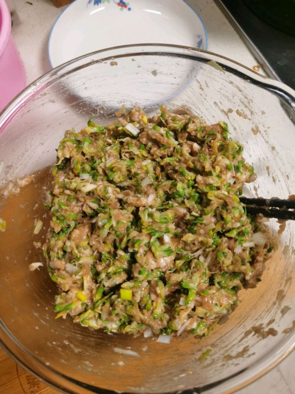 焯好水的槐花,用手攥干水份,放入肉馅中,倒入少许香油。肉馅用葱姜花椒泡的料水,分次打入肉馅搅打上劲并加入生抽,五香粉,少许盐调味即可。(很多网络教程说都要加点韭菜,但个人还是觉得只放槐花原汁原味更能提现槐花的清香味)