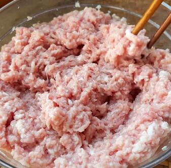 把【前腿肉或五花肉】剁成肉沫(或用绞肉机搅碎)。(肉最好是3肥7瘦的)