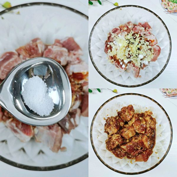 适量盐、少许油、半勺玉米淀粉,放入姜、蒜碎抓匀腌制片刻。(姜、蒜头剁碎)