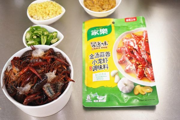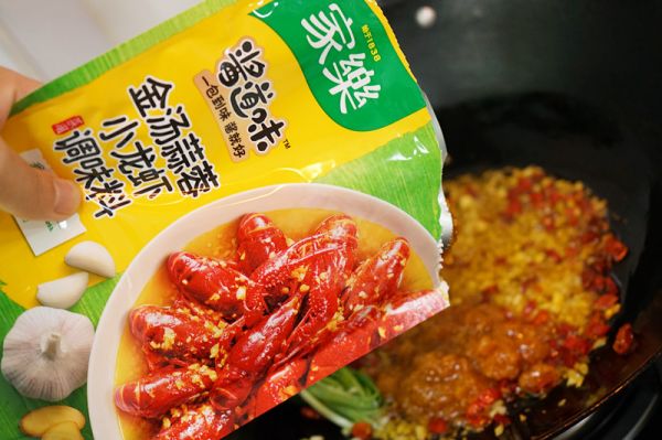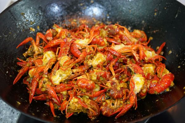 倒入金汤蒜蓉小龙虾底料继续炒香