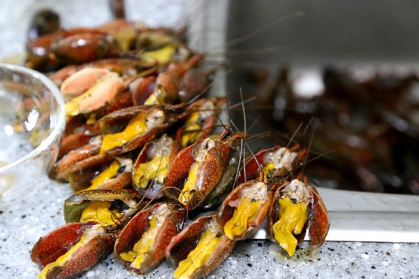 再把头掰开,用小叉子把虾膏小心的弄下来待用