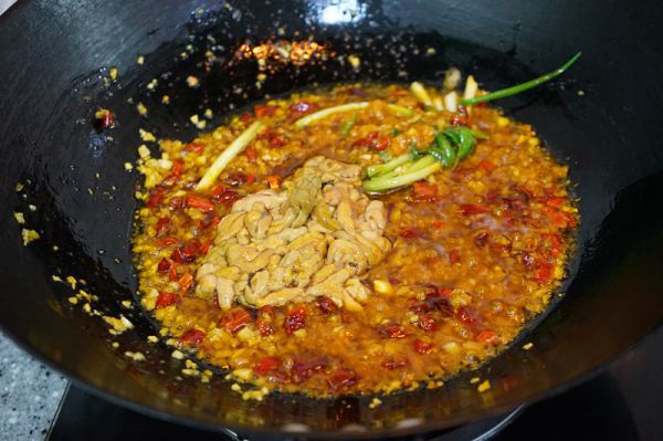 重新洗锅上油,小火爆香大蒜生姜沫小米辣碎