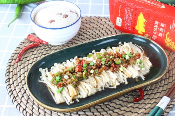 加入2汤匙生抽、1汤匙醋、2勺糖、少许盐调味关火,淋在蒸好的金针菇上,最后撒些小香葱